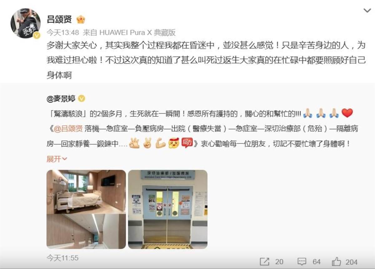 對此,麥景婷向《星島頭條》報平安,透露丈夫已返家靜養,並公開與呂頌賢在病癒後的合照,「多謝關心」。照片中,呂頌賢的臉頰消瘦不少,但仍對著鏡頭露齒燦笑,看起來精神恢復不少。而他也轉發妻子文章,透露因為發病期間都是昏迷狀態,因此沒有太多當時的記憶,但清醒後得知家人在外承受的壓力、擔憂後,也意識到自己在忙碌中應關注身體健康,是此次「死過翻生」的重要體悟。