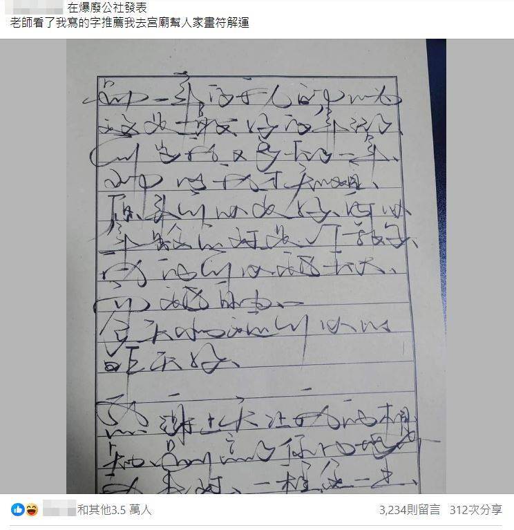 這位原作者幽默地在貼文中回憶起學生時期的往事。因為字跡潦草,她的老師和同學常常需要費盡心力才能猜出作業的內容,甚至有人直言她的字仿佛專為密碼學家量身定制。這一次,她更是在作品旁特意附上笑言:「老師建議我改行去宮廟畫符,這樣比較有前途!」