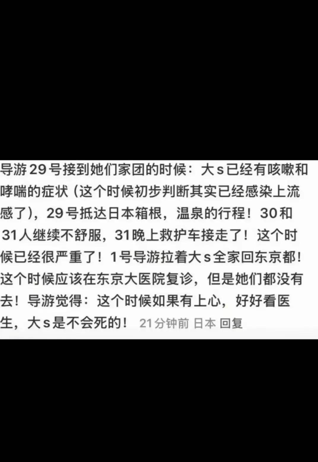 但是,因為當地是個溫泉度假縣城,醫療并不發達,只有小門診。大S先后去了幾次問診,并沒有住院治療,就連醫生建議她去東京醫院,也被找借口拒絕了,最后回到了酒店。