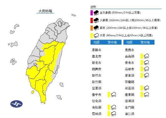 中央氣象署在下午14時10分針對全台9個縣市發布了大雨特報,提醒民眾注意相關氣象變化,提前做好防范措施。