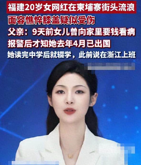 一名有2.4萬粉絲的吳姓美女網紅近日被發現在柬埔寨街頭流浪,手中拿著一組電腦斷層掃描CT照片,皮膚黝黑、神情恍惚,照片在網上瘋傳。網紅的父親表示,網紅曾在去(2025)年12月底表示腿出了問題,需要錢就醫,隨後就在網上發現網友們拍攝女兒的照片。網紅目前已被送到醫院治療,家屬也在大使館的幫助下準備接她回家。