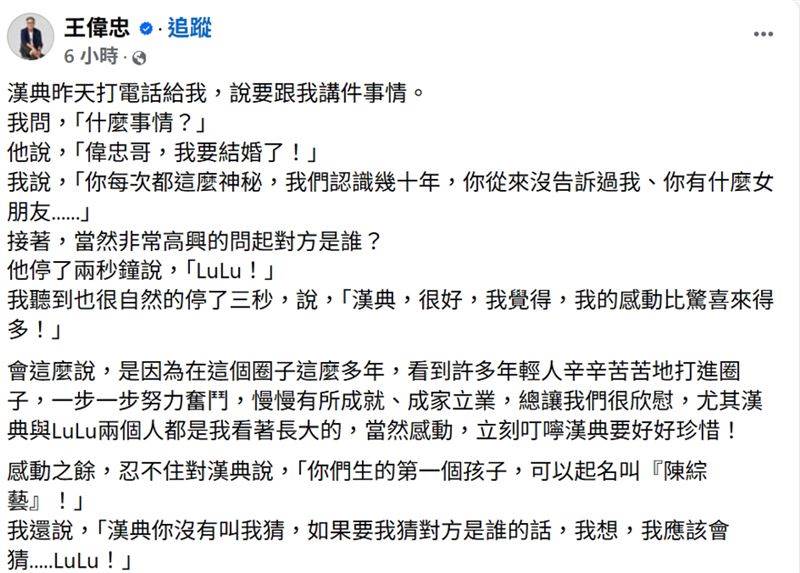 只是財否認LULU有孕的消息,資深製作人王偉忠卻在臉書發文,坦承接到陳漢典親自來電,當下相當驚訝。因為這位相識多年的後輩從未透露過戀愛消息,這次卻直接宣布結婚,讓王偉忠直呼不可思議。當陳漢典賣關子,神神祕祕地開口說要結婚時,王偉忠還打趣地說:「認識這麼多年,你從來沒告訴我你有什麼女朋友。」