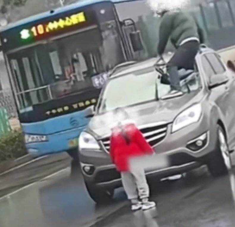 男子追上後繼續砸車,還站在車輛引擎蓋上,用腳踹玻璃,想透過砸窗進入車內。沒幾下玻璃就被男子砸出一個大洞,車內駕駛員迅速倒車躲避。