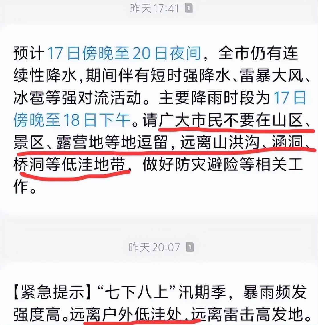 更值得注意的是,出遊前一天,天氣預報已經發布了兩天的預警,提醒人們避免處于地勢低洼處並做好防范,但這一行人卻沒有重視。
