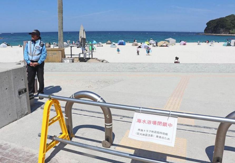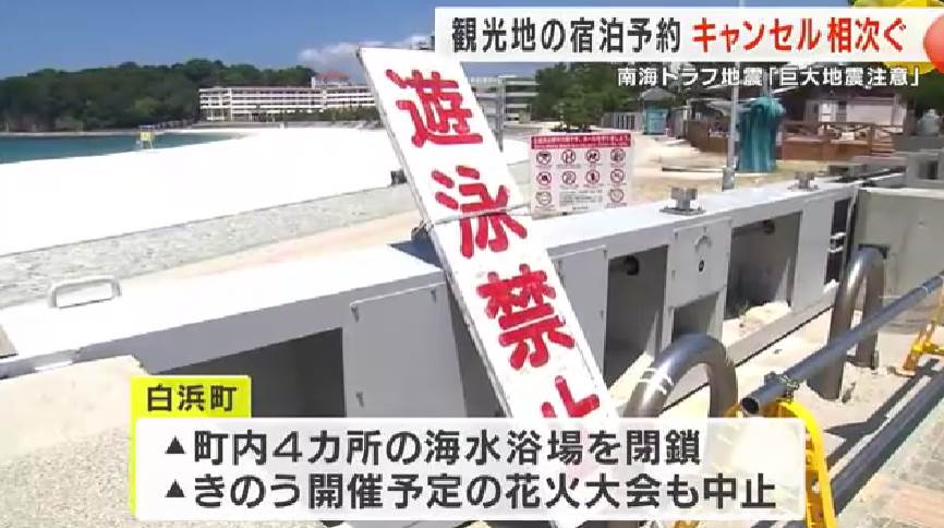 在發生7.1級地震后,正趕上旅游旺季的和歌山縣白浜町,由于發布了南海海溝大地震預警,當地的4個海濱浴場全部關閉,并且掛上了禁止游泳的告示。