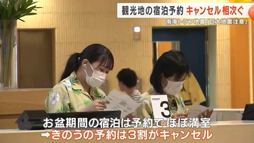 宮崎縣的日南市很多酒店也出現了預約取消的情況,據一名酒店負責人表示,盂蘭盆節期間的30件預約中,有26件數已經取消了。