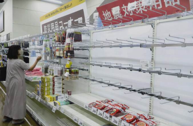 在南海海溝地震預警發布后的第二天,靜岡縣一家超市的食品和防災用品就被全部搶光。