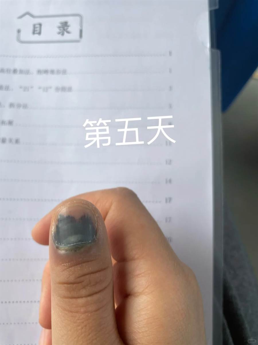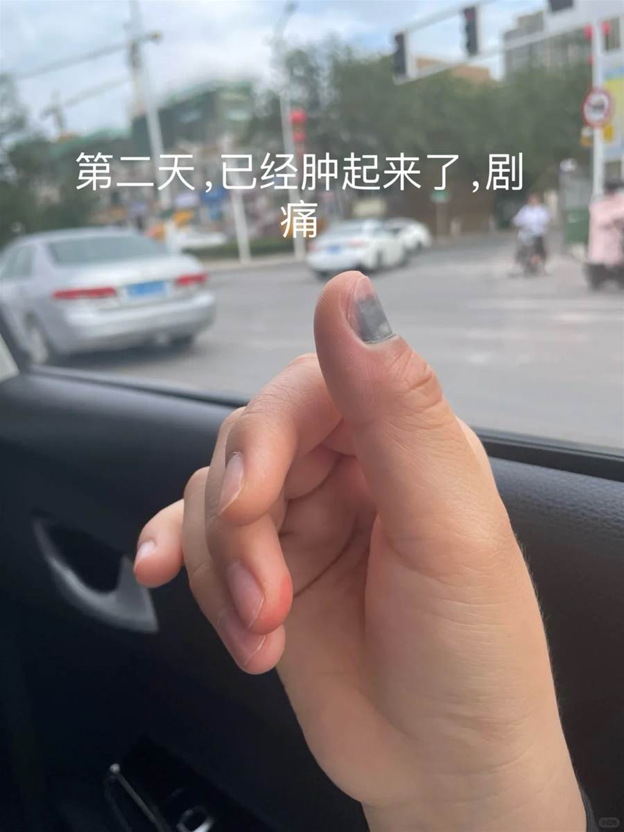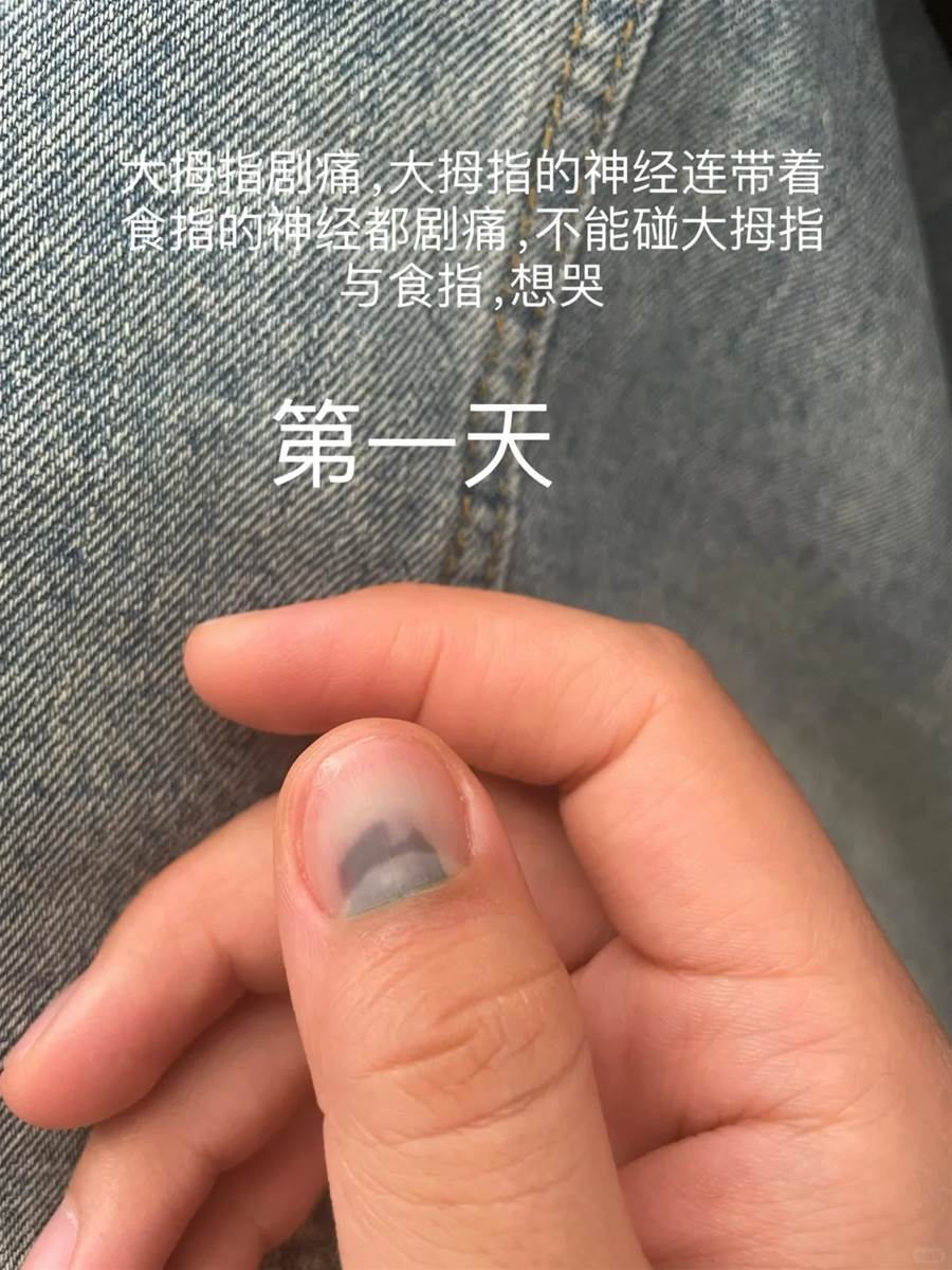 推文網友詳細描述了一次常見的意外:手指甲被車門夾傷。隨著時間的推移,傷情的發展清晰可見:一個月后,整個指甲面變成了全黑色,下面沉積著如同干涸湖泊般的淤血。最讓事主揪心的階段,是新指甲從甲根開始緩慢生長、推出的初期,形態怪異難看,以至于「