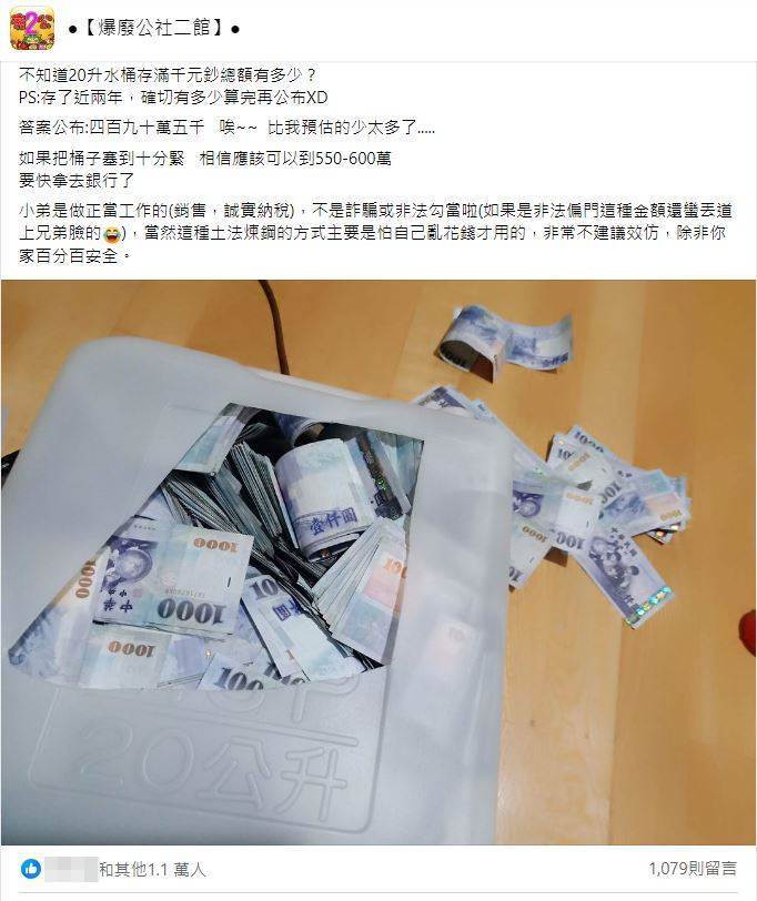 一位網友在臉書社團《爆廢公社二館》發表自己超狂的存錢成果:「不知道20升水桶存滿千元鈔總額有多少?」原PO用水桶存錢約2年時間,開箱清點後竟然存到490萬5千元!不過金額比他預估的少很多:「如果把桶子塞到十分緊,相信應該可以到550-600萬。」