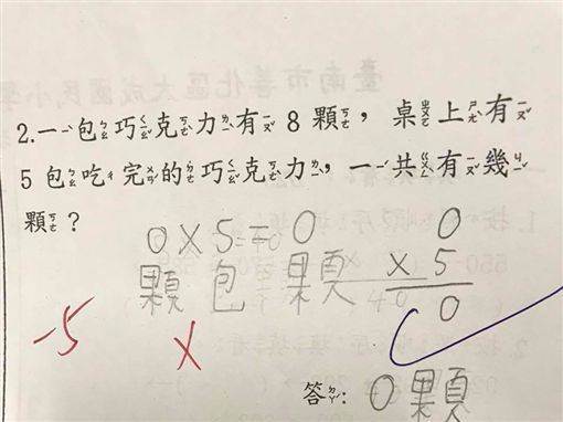 過去也有一位媽媽分享小學兒子答錯的數學習題,因為題目藏有大大的陷阱而引發討論。該題目為「一包巧克力有8顆,桌上有5包吃完的巧克力,一共有幾顆?」許多人一看到題目都會直觀以為老師是在考九九乘法,因此都會非常直觀地認為是8X5=40的答案,但老師卻打上一個叉,並寫上正確解答其實是0顆,因為題目中有特別強調是「吃完的巧克力」,讓大批網友傻眼直喊根本是在考驗邏輯。