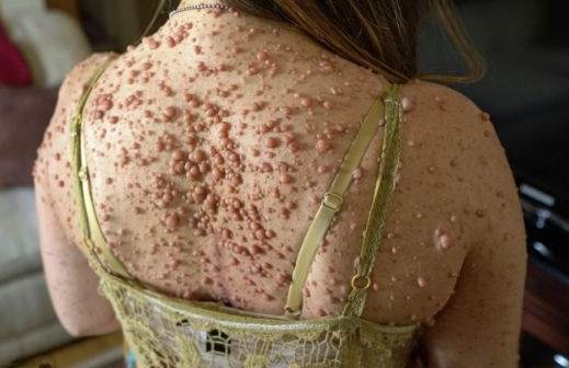Libby Huffer 在幾歲時,因為身體的原因遭受到了當地人們的白眼以及厭煩,導致她心裡上產生了壓抑,曾經想要自盡的她卻堅強的活了過來。而現在的她除了表面皮膚讓人頭皮發麻之外,她每天都要經歷常人無法忍受的疼痛,這個疼痛讓她經常哭泣,但目前醫生對于這個病暫時無法醫治,所以只能每天吃止痛藥。在她還沒有懷孕之前,她身體只是有小小的腫瘤而已。
