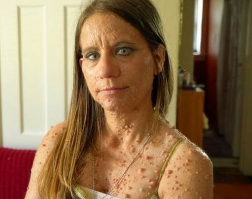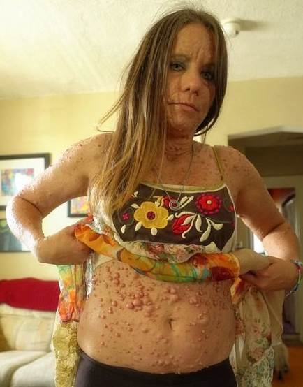 據了解,來自美國韋恩堡的一名女子(Libby Huffer),在懷孕之後,突然身體開始長豆豆,如今39歲的她,全身長滿了豆豆,據醫生稱:她這個是因為懷孕之後因為荷爾蒙的影響身體腫瘤翻倍增長。據了解,女子在5歲時被檢查出患有1型神經纖維瘤病,因為懷孕導致腫瘤翻倍增長!