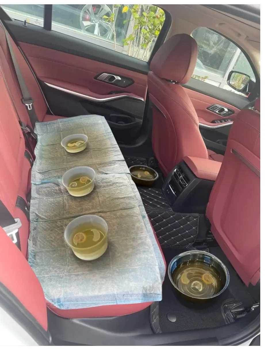 事情的經過是這樣的:車主剛剛購買了一輛新車,滿心歡喜地去提車。然而,當他興沖沖地打開車門時,眼前的景象讓他目瞪口呆。車內后排座椅上鋪著一塊塑料布,上面整整齊齊地擺放著幾碗液體,液體中還漂浮著檸檬片。車主一時之間懵了,這是怎麼回事?他的新車怎麼會被弄得像一個 「化學實驗室」?