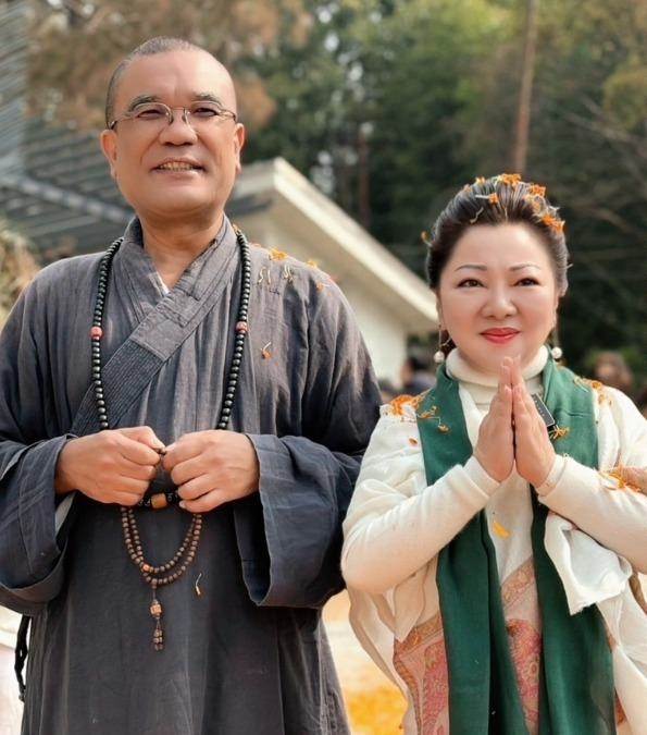 慧光師父秉持「生活中修行」的理念,在尼泊爾創辦小沙彌學院,不僅幫助當地孤兒及弱勢家庭的孩子,更著重培養他們的自給自足能力。學院除了佛學課程外,也將中文列為必修科目,期望透過教育,翻轉這些孩子的人生。照片中,白冰冰虔誠雙手合十,一旁的師父則手握佛珠,露出慈悲笑容。