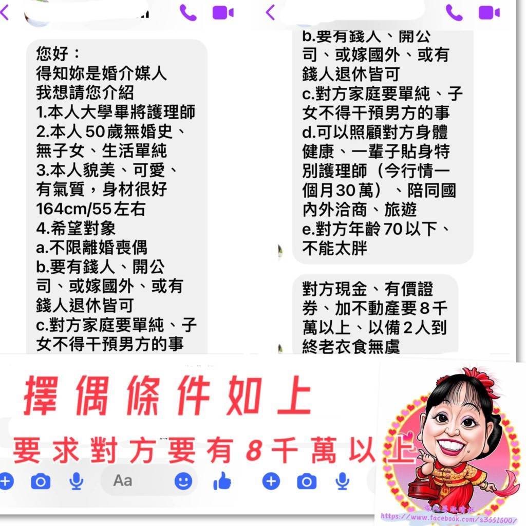 而女護理師列出擇偶條件,包括不限離婚喪偶,但對方要有錢,比如開公司、嫁國外、有錢人退休都可以,家庭也要單純,「子女不得干預男方的事」。不僅如此,女護理師還強調,「可以照顧男方身體健康、一輩子的貼身特別護理師 (行情一個月30萬)」,也能陪同國內外洽商及旅遊。