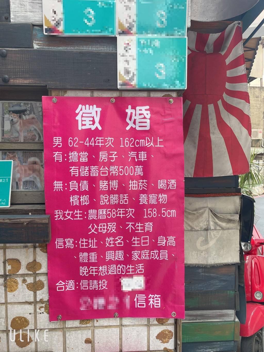 徵婚可以開條件,但要先看看自己幾兩重,不然永遠找不到真命天子。一名男網友在臉書「台南爆料公社」PO出一張徵婚啟事,不少人看到內容後,都大開眼界。