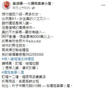 然而,女護理師的要求不只這些,她坦言男方不能太胖,年齡要在70歲以下,其現金、有價證券、不動產要有8千萬以上,以備2人能衣食無慮到終老。女護理師的擇偶條件,讓黃淑晴感到為難,忍不住求助網友,「如果有符合照片中a.b.c.d.e條件的男性朋友,再麻煩您聯絡晴姐」。