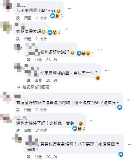 貼出一出,許多網友都紛紛留言「有8千萬的人,不用找對象,年輕妹妹會自己倒貼」、「這個條件可以找30歲的」、「這樣還輪得到她?怪不得放到50了還單身」、「我會自己留著」、「不像找伴侶,應該是挖礦吧」、「難怪嫁不出去」。那麼,你身邊有人符合條件嗎?歡迎在下方留言!