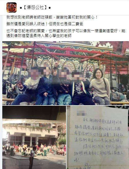 褪色的舊相片封存著溫暖往事。網友在臉書社團「爆怨公社」發文尋人,尋找童年逆境中曾給予他無私幫助的恩師。