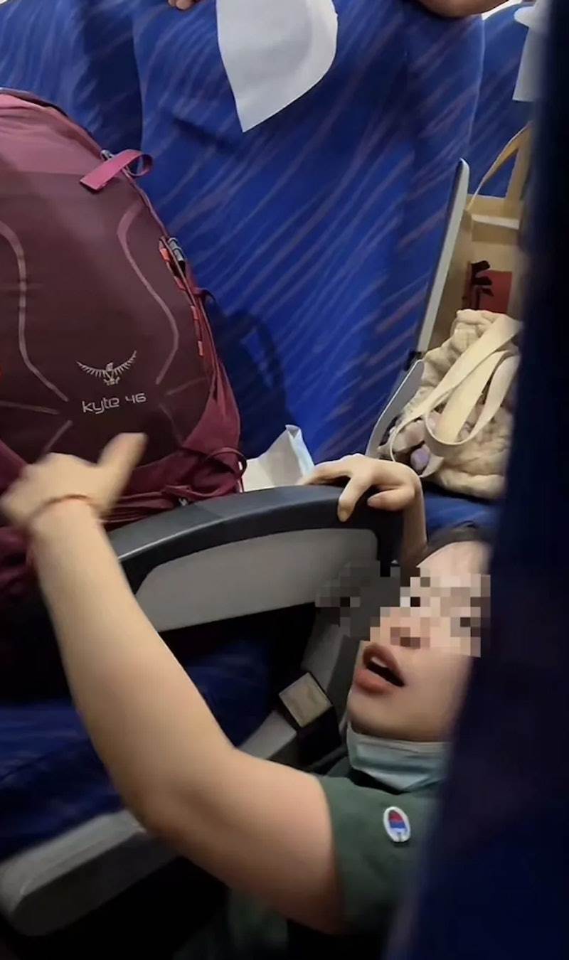 影片畫面顯示,一名女士坐在機艙內的走道上大喊「報警報警,你太過分了,你推我」,還。現場引來多人圍觀,空服員則立刻出面處理,還有乘客在阻攔當事人。