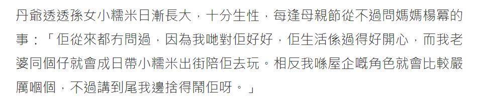 丹爺透露孫女小糯米漸漸長大,非常懂事聽話,每到母親節都不會問起媽媽楊冪的事情:「她從來都沒問過這些,因為我們對她很好,她生活得很開心,我太太和兒子會經常帶小糯米出去玩。