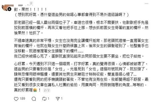 同時,也有不少人提醒女性乘客,若在公共場合遇到類似不舒服的狀況,應勇敢立即向周圍求助或直接報警,避免成為沉默的受害者。