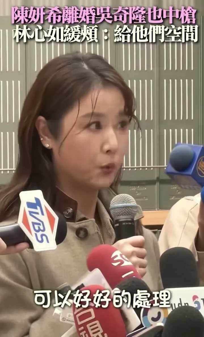 照片中的林心如穿著簡單的卡其色外套,面對著聚光燈下無數的鏡頭,她輕輕地抓住麥克風,神情嚴肅而溫和。