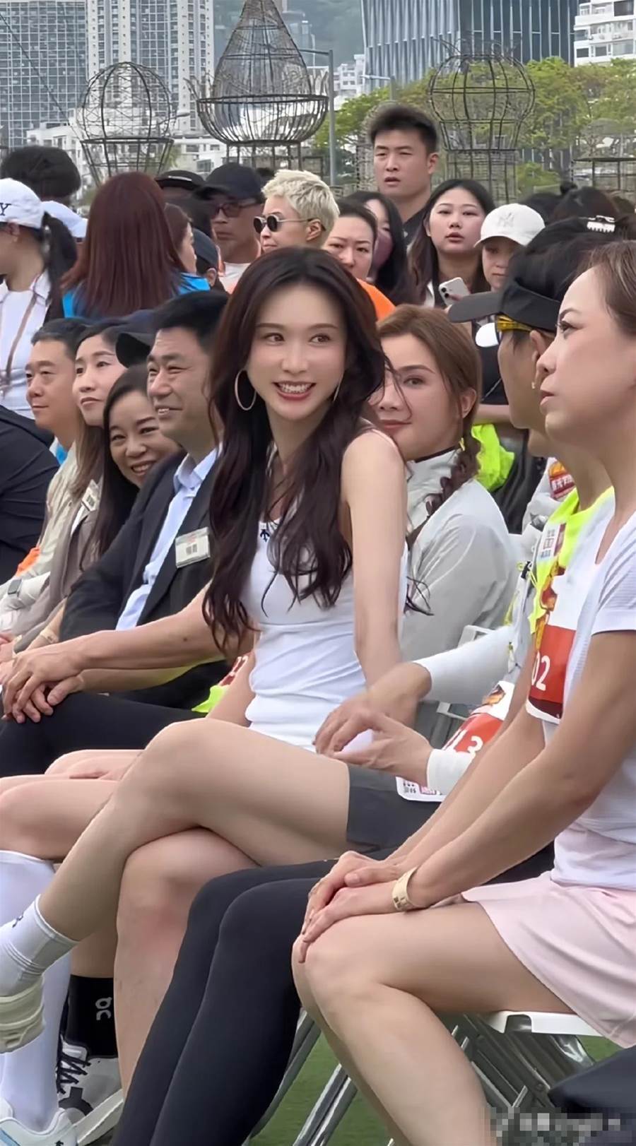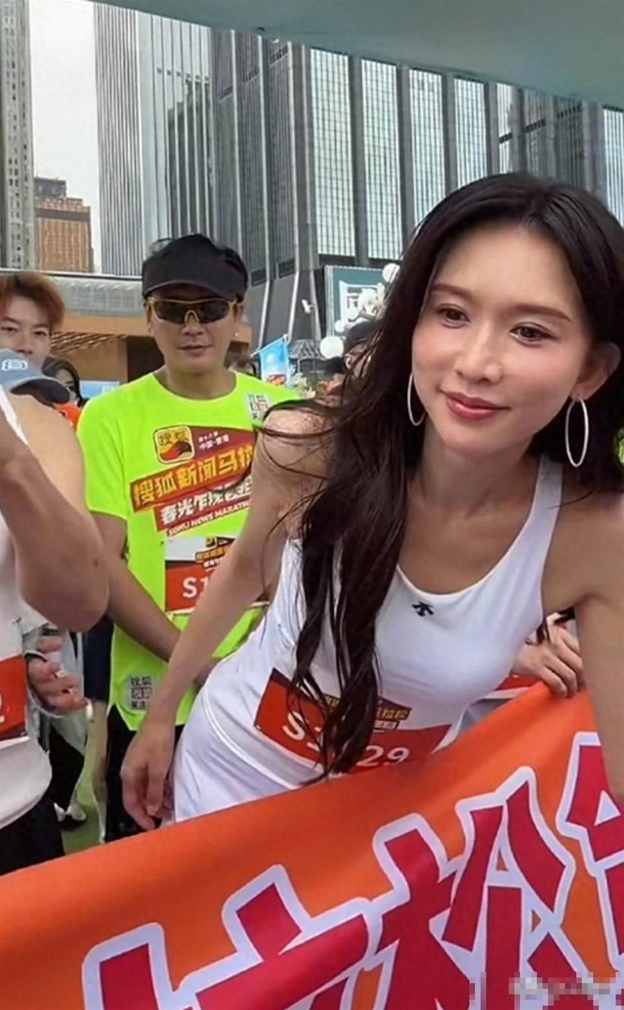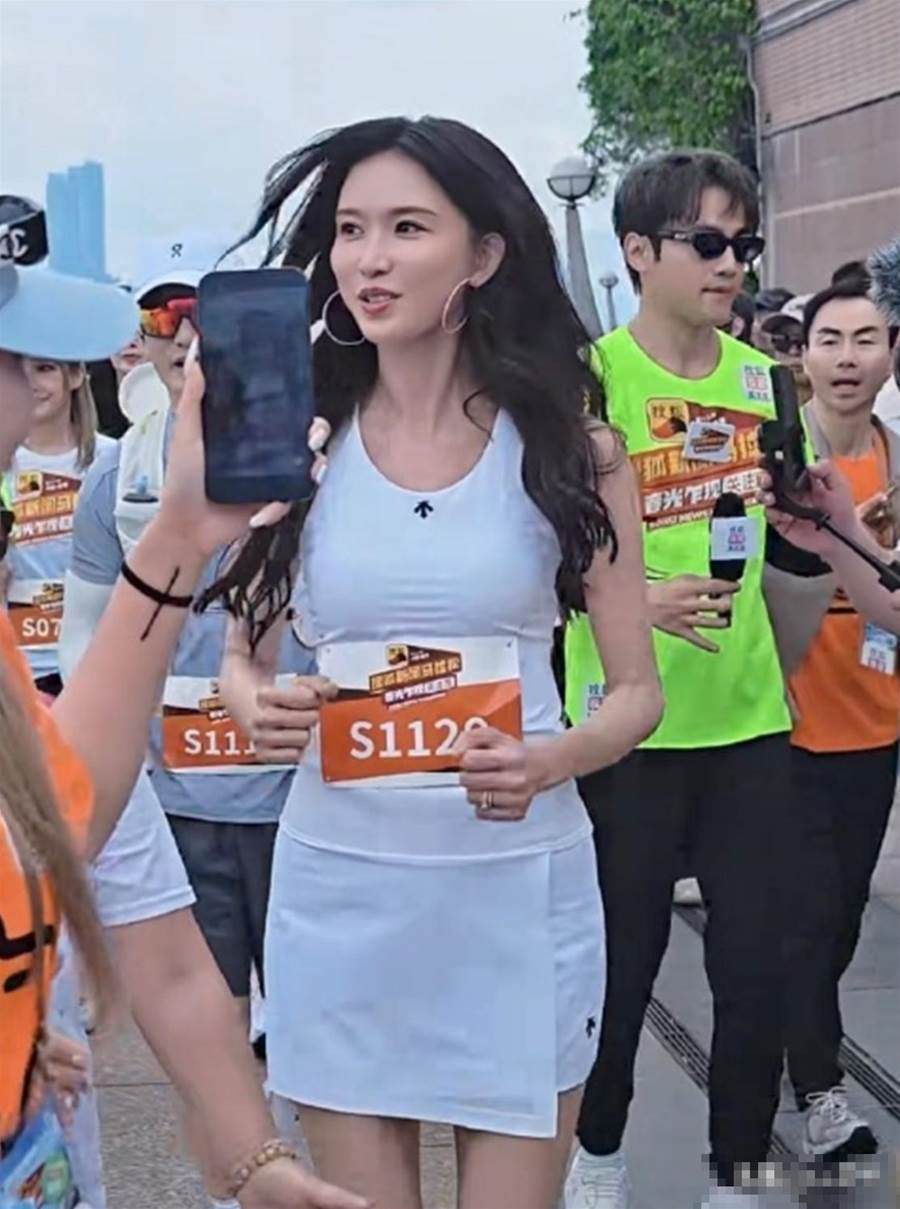 51歲的林志玲穿著白色運動背心出現在香港灣仔海濱公園,跟著人群就跑了起來。