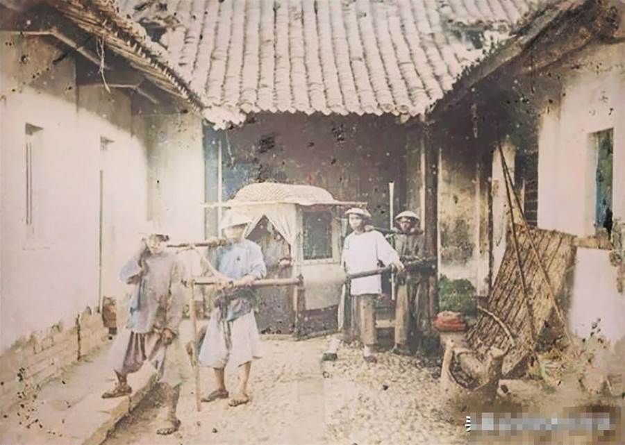 官老爺出門的場景,有轎夫四人。轎子一直為官場所用,鄉紳權貴也沒有資格。《清史稿》亦載:「四品以下文職,輿夫二人,輿頂用錫。直省督、撫,輿夫八人。司道以下,教職以上,輿夫四人。」可以說當時的轎子,就是官府的象征,不用鳴鑼,見之回避。