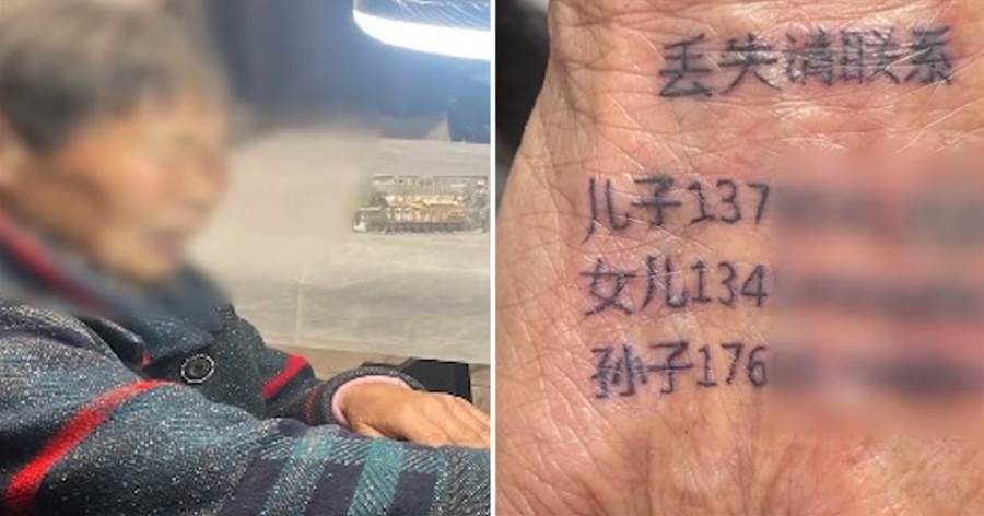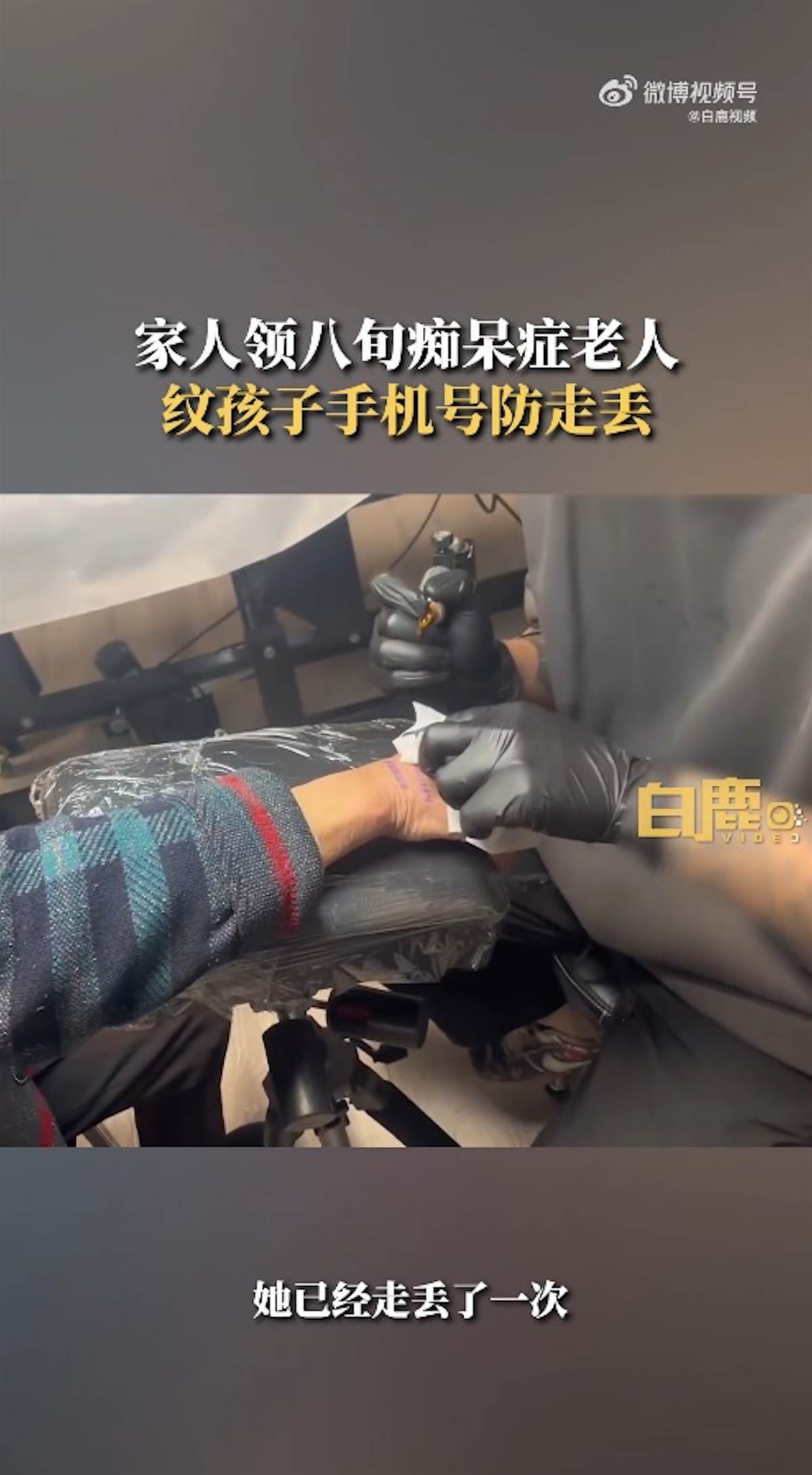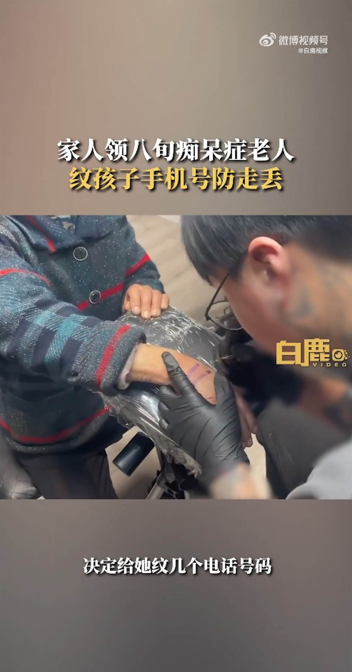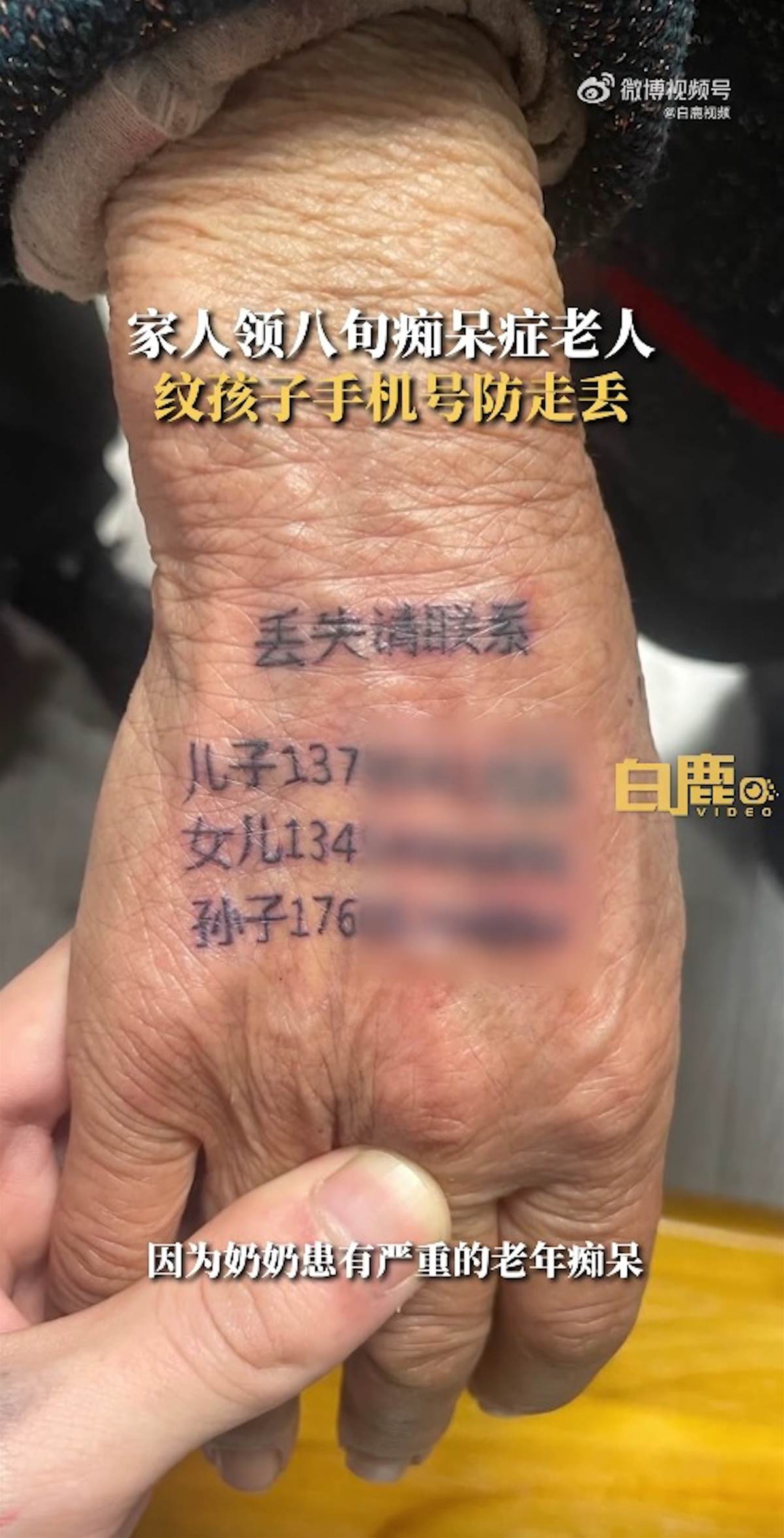 據「白鹿視訊」報道,紋身店老闆陳先生指出,婆婆的年齡介乎80至90歲,因患有嚴重腦退化,故其家人聯繫他,幫忙將兒女和孫子的電話號碼紋在手背上。陳先生說,「這個奶奶其實也挺怕疼的」,但有兒子和孫子陪伴在旁,最終忍痛紋好。從影片可見到,婆婆手背紋上了「丟失請聯繫」字句和3人的電話號碼。
