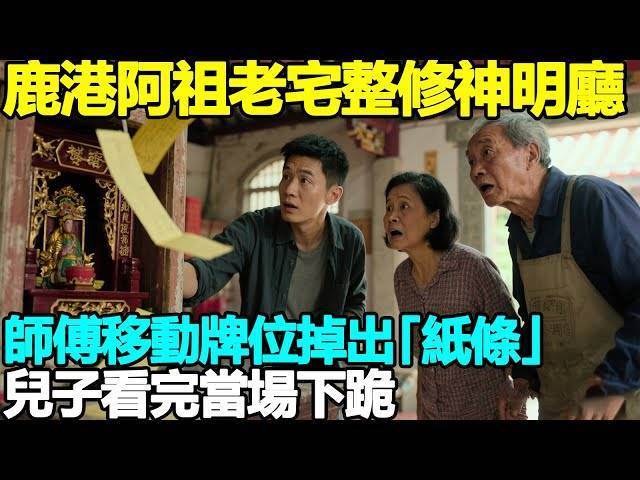鹿港的一座百年老宅,因歲月侵蝕,終于迎來了整修的一天。老宅的主人林先生帶著幾個工匠,在屋內忙碌了好幾天,準備修補神明廳的老舊牌位。然而就在拆卸牌位時,現場竟意外掉落出一張泛黃的紙條。這一神秘的發現瞬間吸引了在場所有人的注意。林先生上前撿起紙條,細細展開時,突然愣住,隨即眼眶泛紅,整個人跪倒在地。所寫內容讓他內心翻江倒海:原來在這座老宅中,隱藏著一段不為人知的秘密。