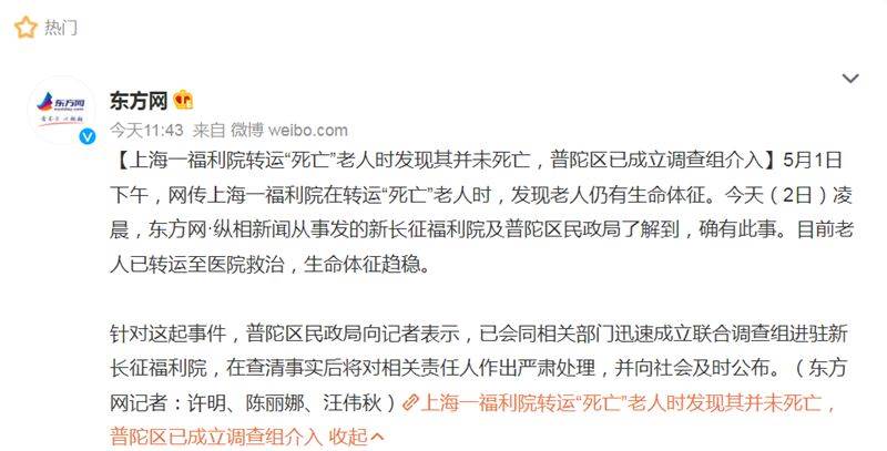 而根據《東方網》報導,上海市普陀區民政局也證實確有此事,差點誤被火化的長者,目前也已被轉移至醫院救治,生命體徵趨于穩定。而相關當局目前也已經會同相關部門迅速成立聯合調查小組,進駐事發的「新長徵福利院」,並對涉事單位和相關責任人員祭出3項懲處...