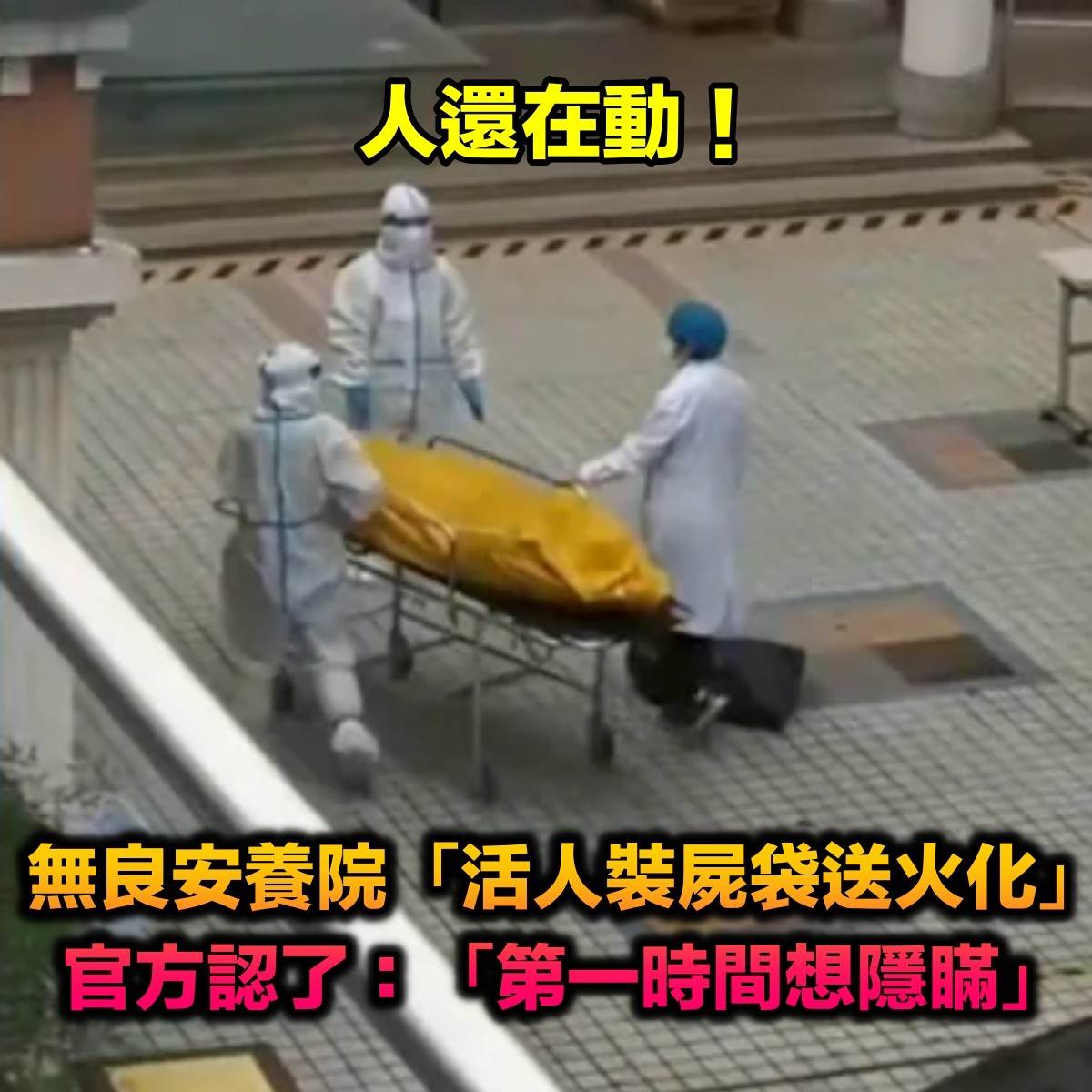 當時殯儀館人員對此感到不可置信,掀開黃布再次確認後,驚呼「看到了吧!活的!」,但沒想到安養院人員確堅持幫老人蓋上黃布想隱瞞,直到最後被殯儀館人員喝止「不要再蓋住他了!」。