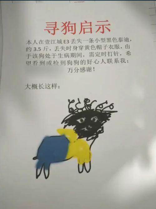 根據《重慶商報》報導,重慶市江北區石馬河一位主人心急如焚,因為她家的黑色貴賓狗跟著鄰居進電梯後走丟了。飼主趕著印尋狗啟事,但中途斷網傳不了照片,她乾脆放手繪圖說明「大概長這樣」。因為狗狗生病需要定時打針,所以主人希望能盡快找回愛犬。