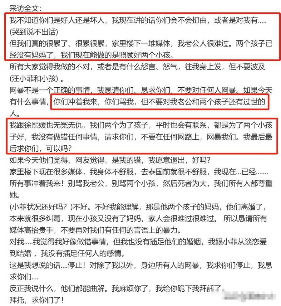 馬筱梅在受訪的時候也表示,因為大S去世這件事兩口子都很累,樓下全是記者,汪小菲也很難過,兩個孩子剛失去母親,所以自己和汪小菲能做的就是照顧好兩個孩子,鑒于現在鋪天蓋地的網暴,馬筱梅也懇請外界有什麼事情沖她來,不要傷害汪小菲和孩子們,更何況自己和大S無冤無仇,自己沒有做錯任何事情,懇請媒體和網友們,不要再網暴他們。