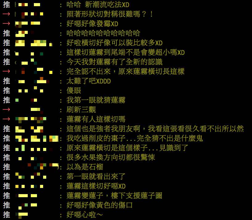 這個答案一出爐,所有人立刻就笑到噴飯,表示「今天我對蓮霧有了全新的認識」、「這樣看起來好噁」、「有點詭異」、「感覺變不好吃了」、「我吃過削皮的棗子...完全猜不出是什麼鬼」、「新潮流吃法 XD」。另外也有部分人,對于原PO朋友的切法感到非常不解,「照著形狀切對稱很難嗎」、「這樣切蓮霧到尾端不是會變超小嗎」、「切到蓮霧的媽媽也認不得」。
