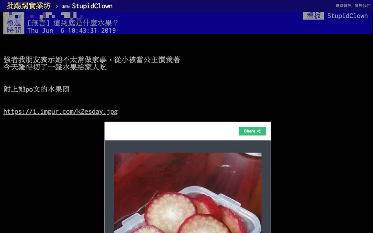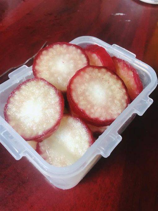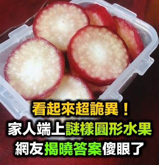 根據《三立新聞網》報導,這位網友在PTT上分享了一張照片,表示自己有位平常不太常會做家事、從小被當成公主慣養著的朋友,而這位朋友日前難得走進廚房,主動切了一盤水果給家人吃,結果一端出來,大家立刻就傻眼了,只見那盤水果被切成了圓形片狀,果肉是白色的,外面則是有一層桃紅色的果皮,光是用看的,根本猜不出來這到底是什麼東西。