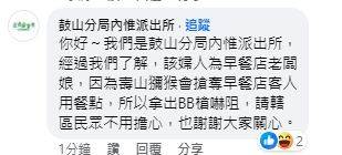 文章引起熱論,還有熱心民眾報警,對此,鼓山分局內惟派出所也出面回應,「我們是鼓山分局內惟派出所,經過我們了解,該婦人為早餐店老闆娘,因為壽山獼猴會搶奪早餐店客人用餐點,所以拿出BB槍嚇阻,請轄區民眾不用擔心,也謝謝大家關心」。