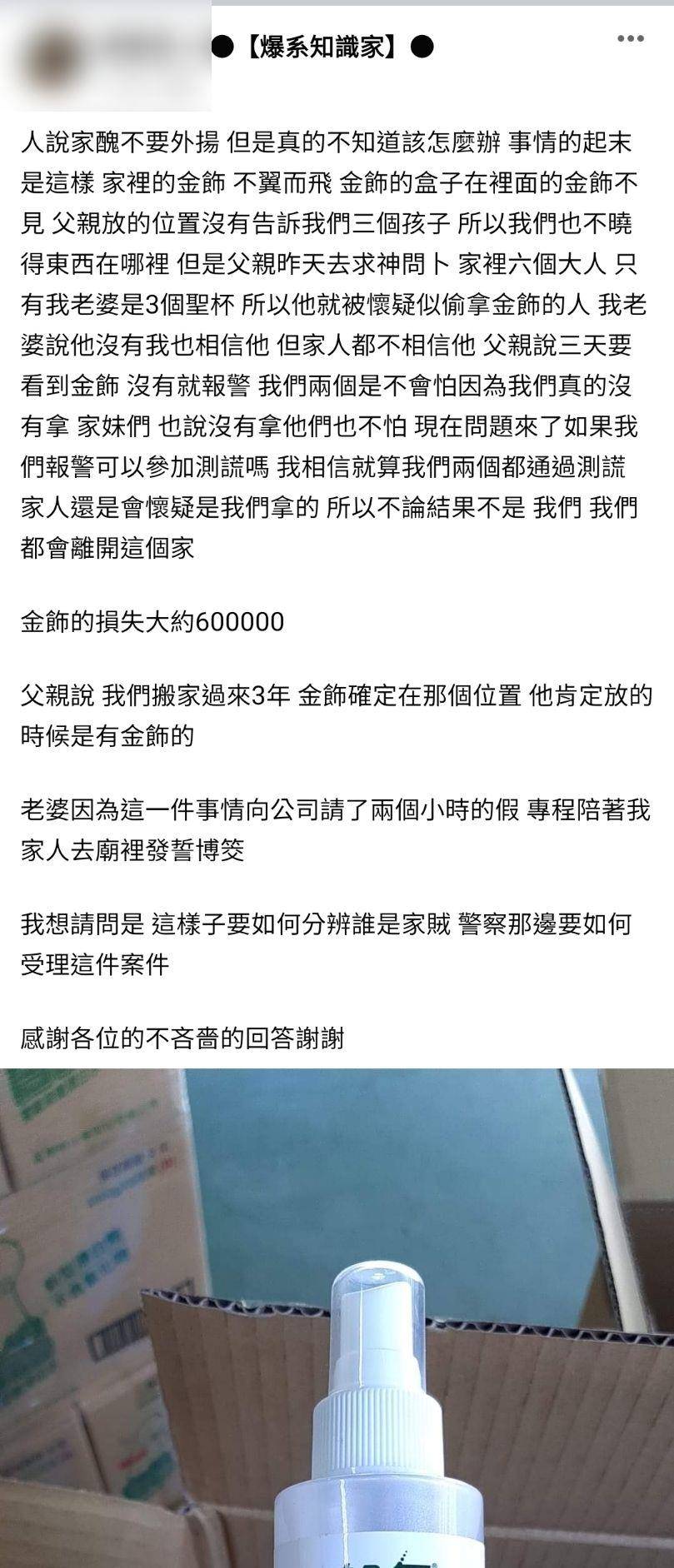 懷疑家裡遭竊時,一般人首先想到的,都是趕快報警處理,不過卻有一位網友無奈表示,爸爸發現家裡價值60萬元的金飾不見後,竟然二話不說帶著家裡的6個大人,一起到王爺廟問卜,結果還真的只有老婆連續擲出3個聖筊,于是馬上成為了爸爸口中的「鐵證」,儘管他相信老婆的為人,但其他家庭成員的異樣目光,還是讓夫妻倆感到難受不已。