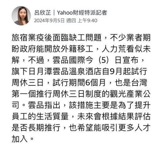目前,云品溫泉酒店已經全面推行了周休三日政策,