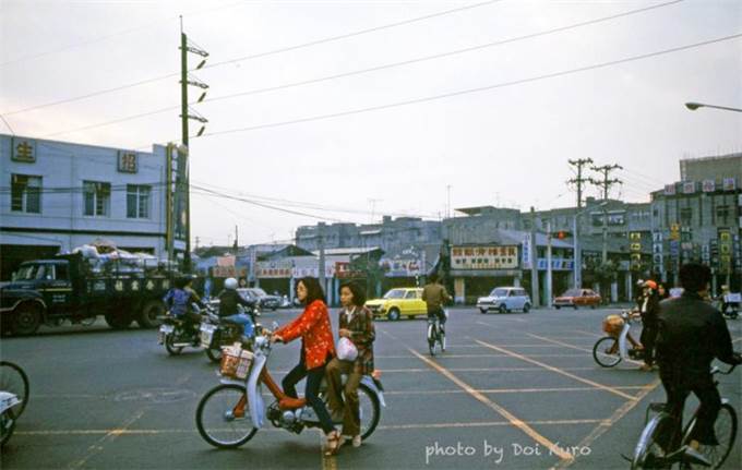 1、一名日本人拍攝的1979年台灣:山下的集市,有騎機車與腳踏車的