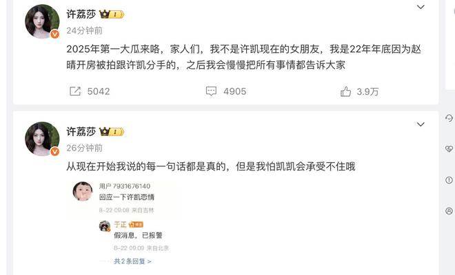 2025年內娛「第一大瓜」來了,前嫂子下場猛錘流量藝人許凱,兩人戀愛時間線曝光,許荔莎公開與許凱交往詳細過程,信息量超大引嘩然。