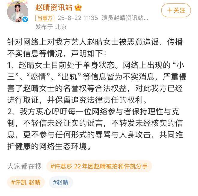 為了趕緊撇清關系,趙晴方火速通過工作室發聲,否認「出軌」、「小三」等傳聞。