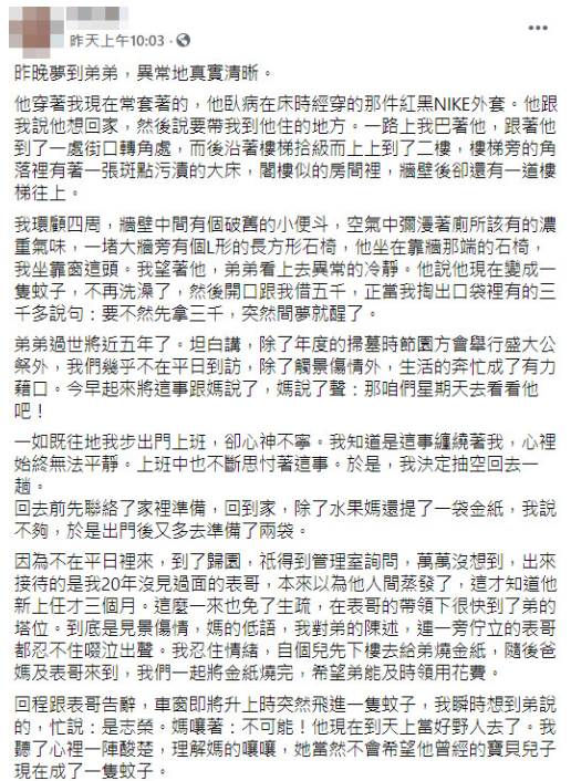 原PO表示最近夢到了過世5年的弟弟,還在夢中說他很想回家,接著就帶原PO去一個很老舊的地方,看上去異常冷靜。弟弟說自己現在變成一隻蚊子,不用再洗澡了,還想跟原PO借5000元,正當原PO掏出口袋的3000想說先拿這些時,就從夢中醒過來了。