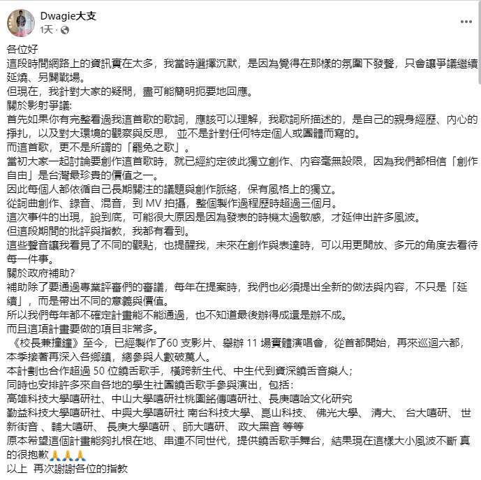 對于這次風波,大支坦言可能是發表時機過于敏感所致。他表示已看到各方的批評與建議,這些意見讓他體認到未來創作時需要以更開放、多元的視角看待事物。