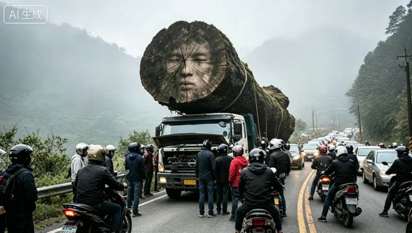 現場圍著好奇人群。阿樹師顫巍巍走近,伸出布滿老繭和舊傷的手,輕輕撫摸那冰冷的、如鐵般的木質,還有那張「人臉」樹瘤。他老淚縱橫,撲通一聲跪了下來,對著木頭磕了個頭。