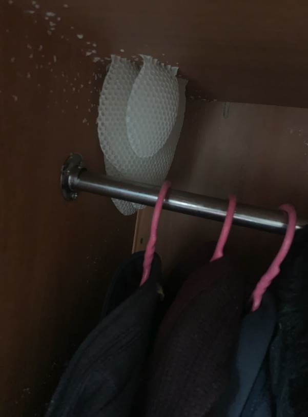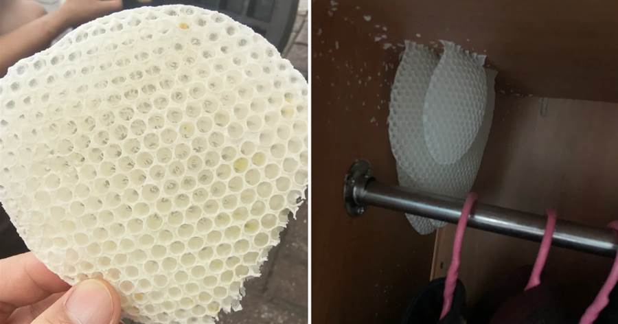 一名網友就在小紅書上發問,他表示在外公的衣櫥裡看到好幾片奇怪的白色格狀物,大小不一但十分整齊的黏在櫃子深處,看起來超級詭異,他忍不住拍下來問大家這到底是什麼東西?