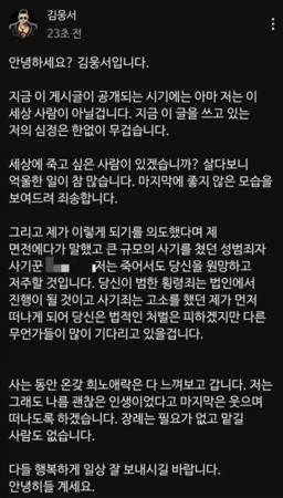 文字裡,金雄舒更指名提到一位「性詐欺犯罪者」金學洙(音譯,김학수),他氣憤地寫下「即使我死了,也會詛咒你怨恨你」,指控對方犯下挪用公款、詐欺等罪名,雖然在法律上逃過一劫,但總有一天會遭到制裁。文章最後一段,他說:「人生在世,我嚐過了喜怒哀樂才離開,我覺得我也算是過了一個還不錯的人生,會努力笑著離開的,不需要幫我辦葬禮,因為也沒有要託付的人。