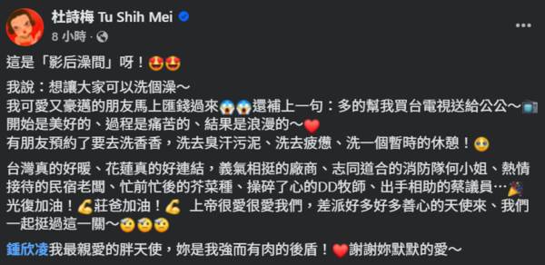 杜詩梅透過社群媒體分享這次善舉的起源,表示在她萌生為災民設置「臨時沐浴空間」的想法後,摯友鍾欣凌立即以實際行動支持,不僅迅速匯款資助,還貼心地提議添購電視機給公公。