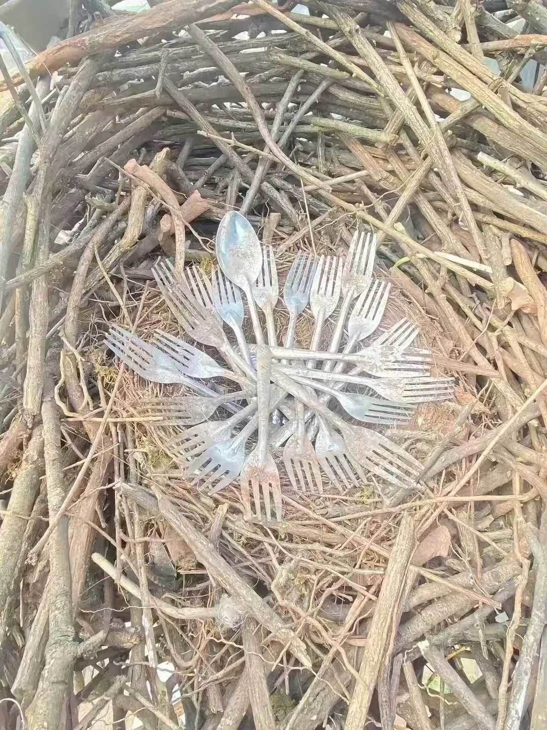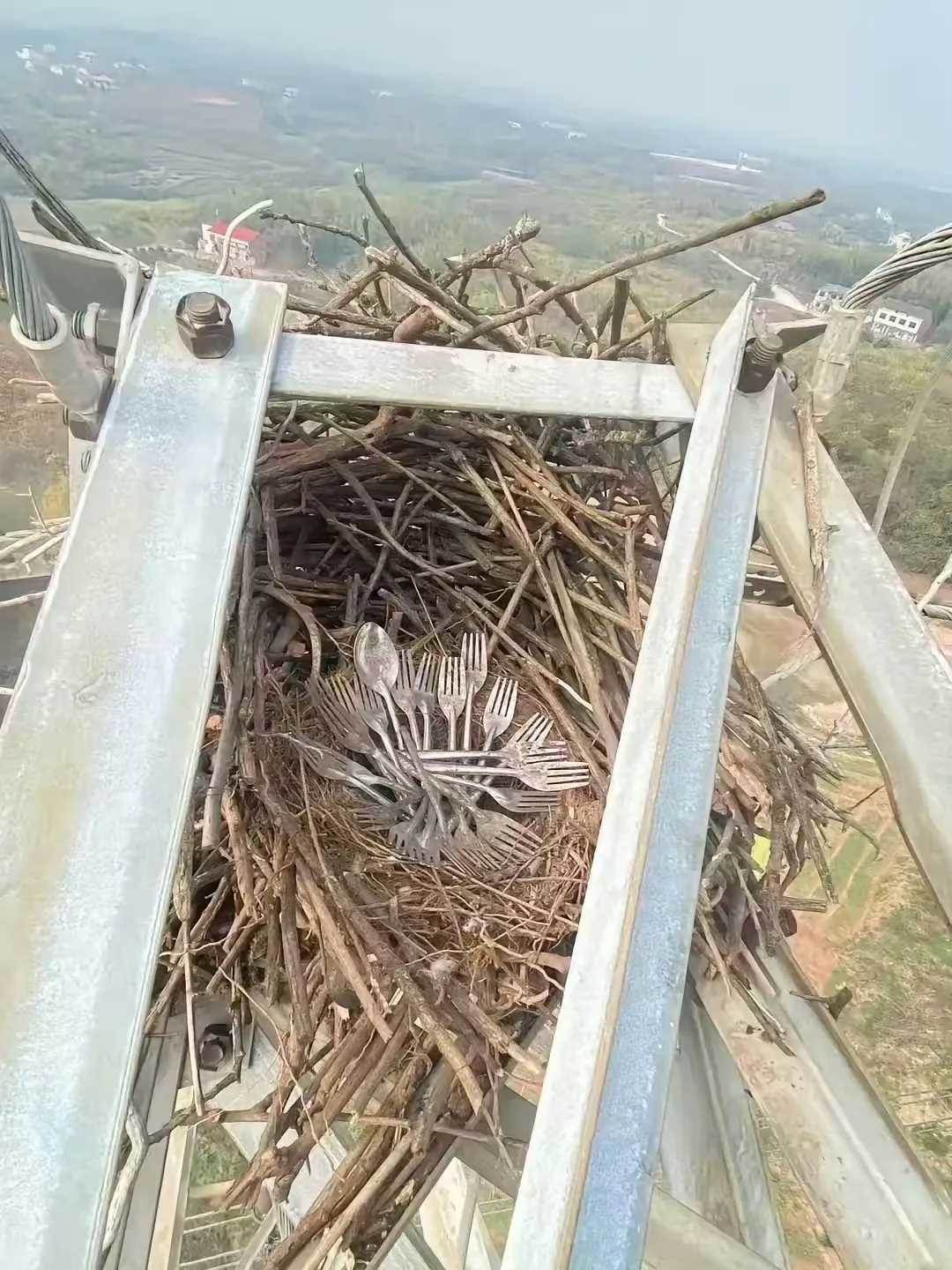 電力工人在百米高空,拍到鳥窩里有好幾把叉子和勺子。